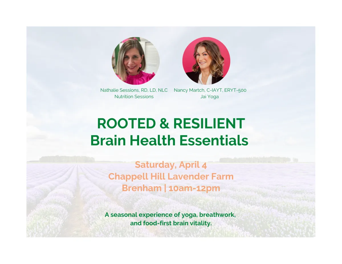 Join Registered Dietitian Nathalie Sessions of Nutrition Sessions and Yoga Therapist Nancy Martch of Jai Yoga Houston for an intimate, sensory morning supporting cognitive vitality through gentle movement, intentional breath, and food-first nourishment.